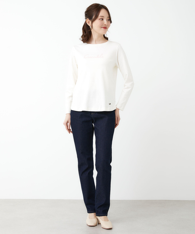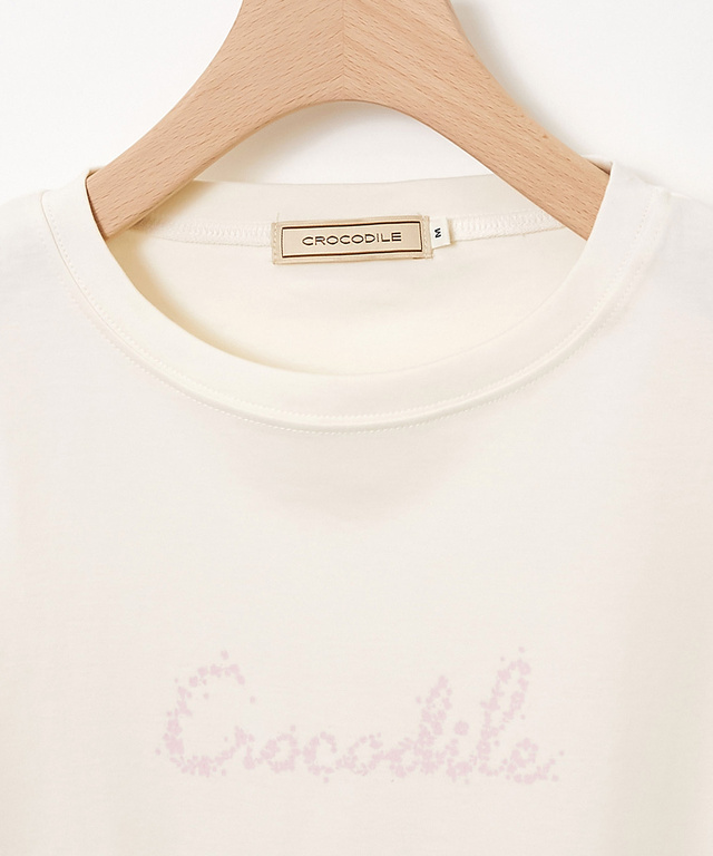 インナーにも1枚着にも使いやすいクルーネックの長袖Tシャツ。小花柄のCROCODILEロゴを胸に配した色と、ロゴが苦手な方のために単色の小花柄を生地プリントした総柄プリントのものと、選んでいただける3色展開です。