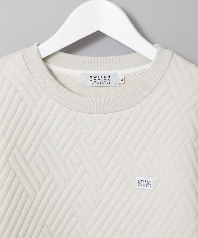 立体感のある幾何学模様柄が特徴のブリスタージャカード生地のカットソー。襟、袖口、裾口にはストレッチの効いたリブを切り替えてスポーティなデザインに仕上げました。一枚で存在感を演出できるアイテムとなっています。