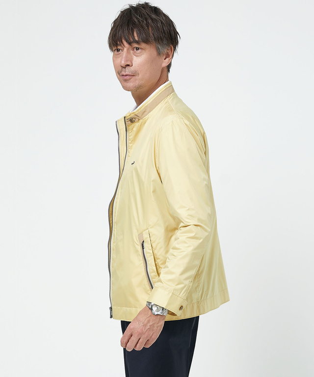 ポリエステルタフタを使用したライダースジャケット風のデザインを取り入れたショートスタンド襟のブルゾンです。腰のダブルポケットに携帯など小物を入れることができ機能的で便利なアイテムです。イエロー、レッド、ブラックの3色展開でご用意しております。