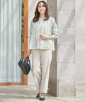 低めのスタンドカラーと胸元にはピンタックデザインを入れることで、こなれ感を演出。