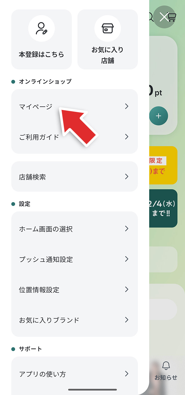 アプリの「メニュー」内にあるマイページからも会員証(QRコード)を表示できます。