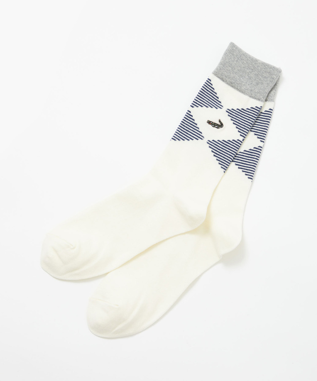 トラディショナルなアーガイル柄をボーダーで表現した爽やかで春らしいクルー丈ソックスです。マリンテイストも少し感じられる若々しい印象に仕上げました。キレイ目にもカジュアルにもスタイリングを選ばず活躍してくれるアイテムです。