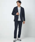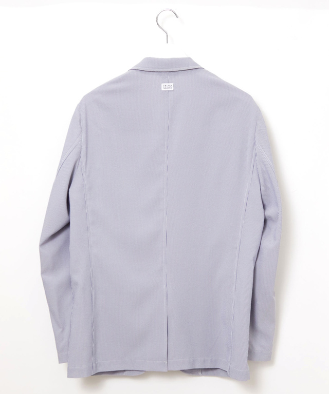 ポリエステルサッカーストライプ素材を使用したジャケットです。腰のファスナー付きポケットによりカジュアルな印象のアイテムです。襟裏の釦を留めると少し肌寒いときの風よけにもなります。ブルーとネイビーの2色展開でご用意しております。