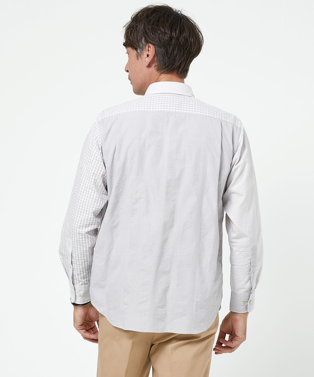 柄は英国調を意識したストライプ柄、チェック柄、グレンチェック柄を使用しクレージーパターンに仕上げました。織はフラットサッカー素材を使用しております。吸汗速乾機能が付いているため、暑い日のお出かけでも安心して着ていただけるアイテムです。