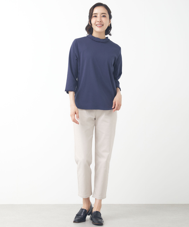 浅いハイネックと七分袖で、季節の変わり目にちょうどいいと思います。