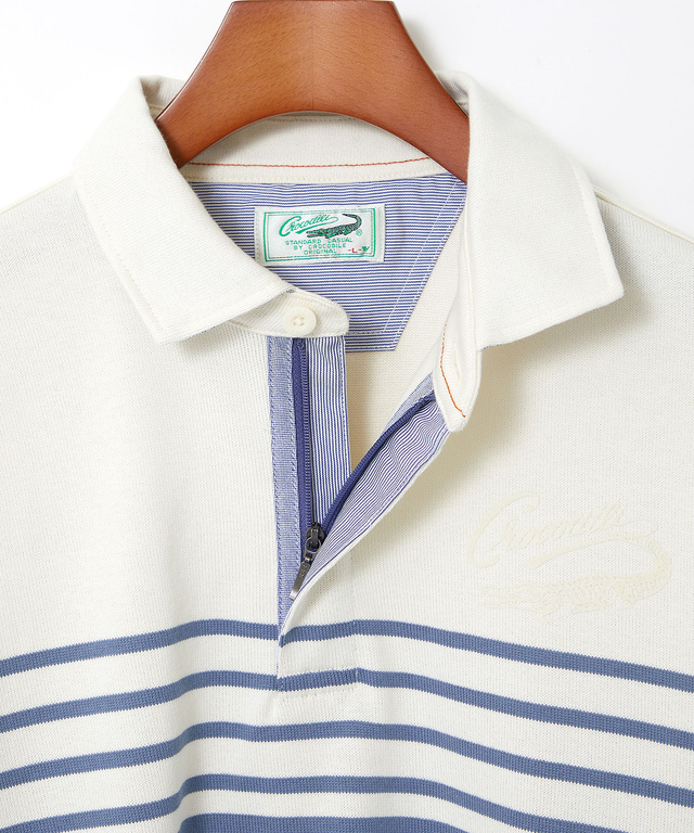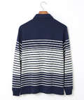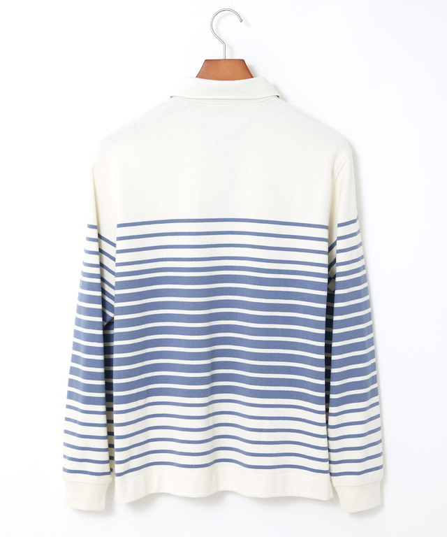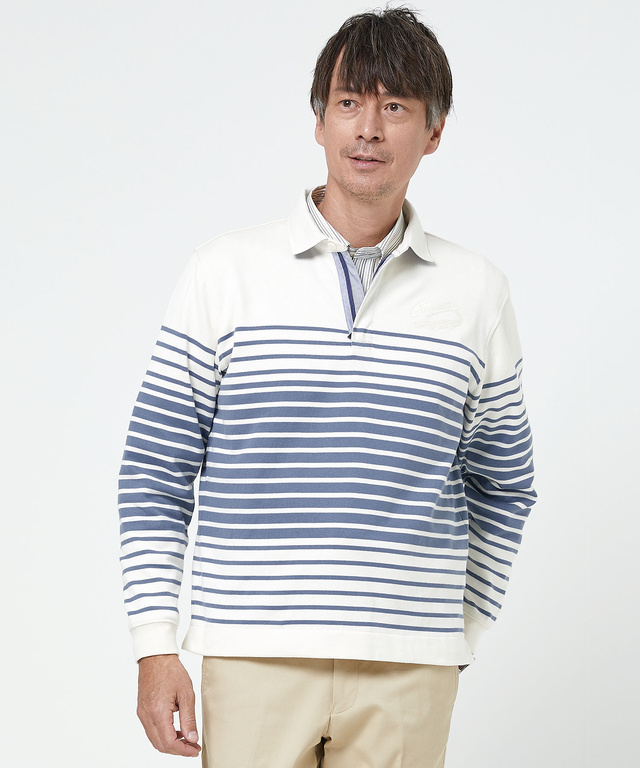 バスクボーダー調のパネルボーダー柄がスッキリと若々しい印象のプルオーバーです。ふっくらと編み立てた肌触りの良い天竺素材で快適な着心地のアイテムです。ブルゾンとのスタイリングに合わせやすいよう、サイズ感にもこだわりました。