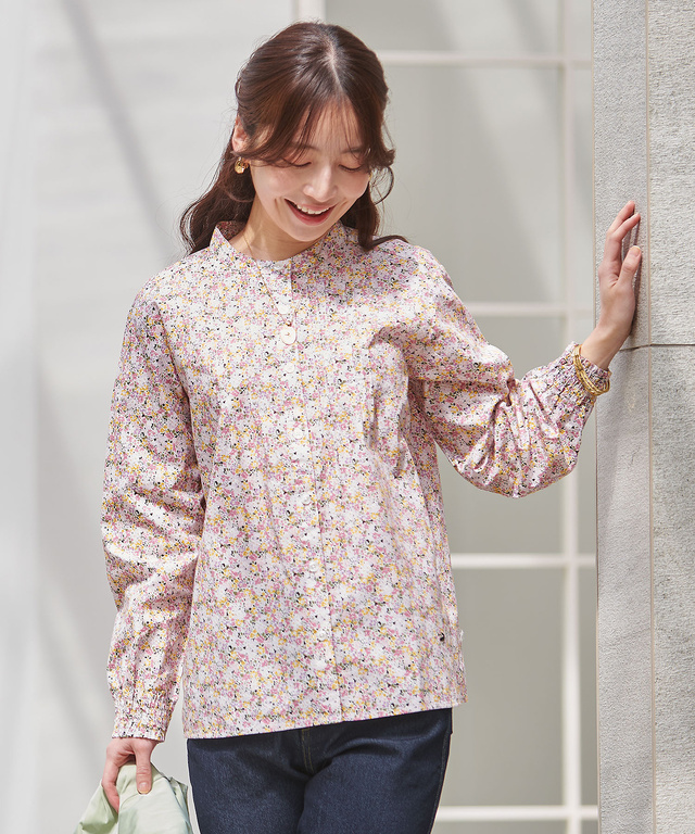 春らしいパステルカラーの小花柄プリントを施したデザインブラウス。