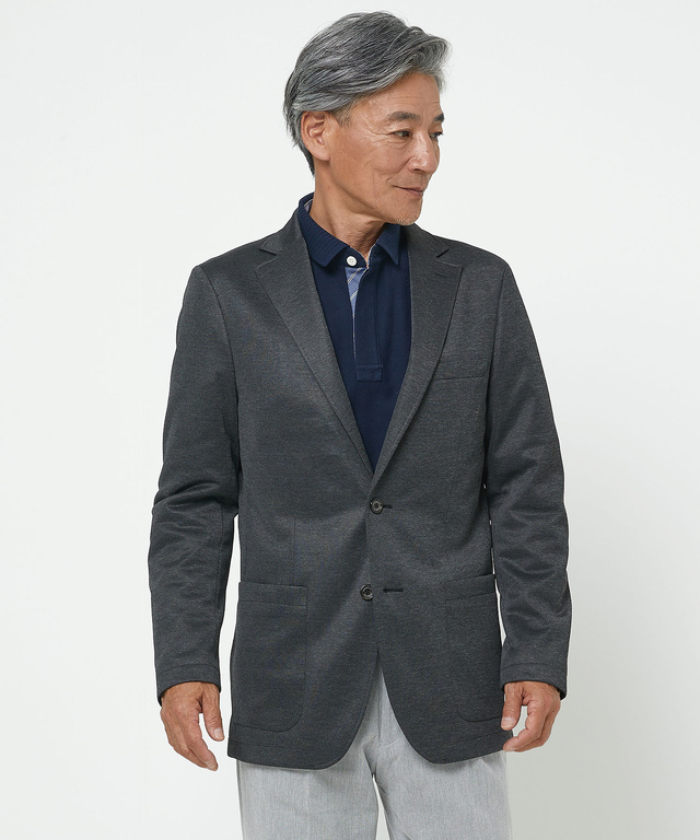 上品な光沢のある尾州産のジャージー生地を使用したジャケットです。伸縮性に優れ、着心地が良くデイリー使いしていただけるアイテムです。グレーとチャコールの2色展開でご用意しております。