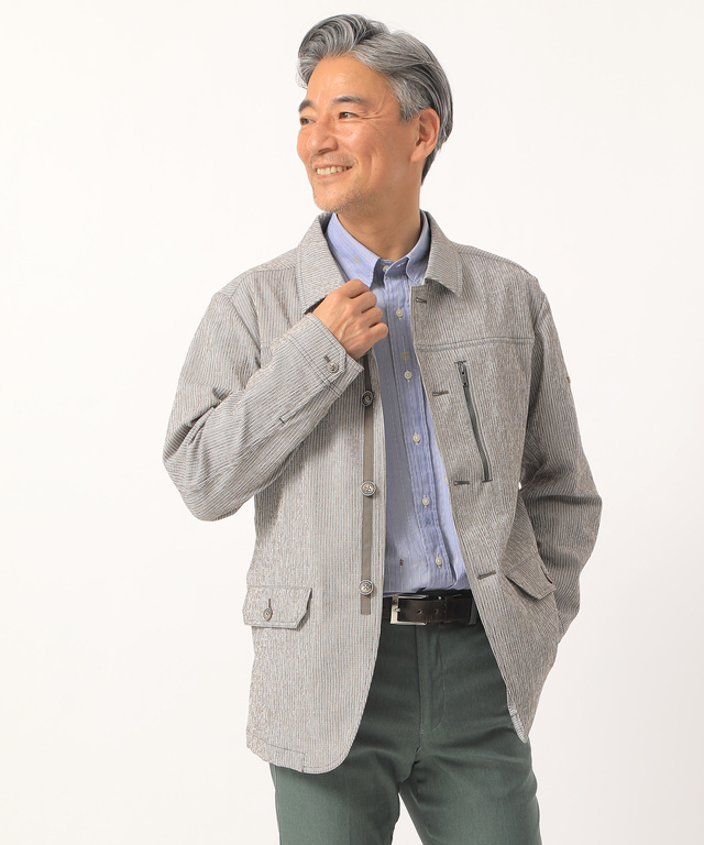 凹凸のあるクレープ生地を使用したカバーオールジャケットです。 細かいストライプ柄は、カジュアルでも上品に見せてくれる大人向きデザインです。 デニムやチノパンなど、カジュアルなボトムスと相性が良いアイテム。