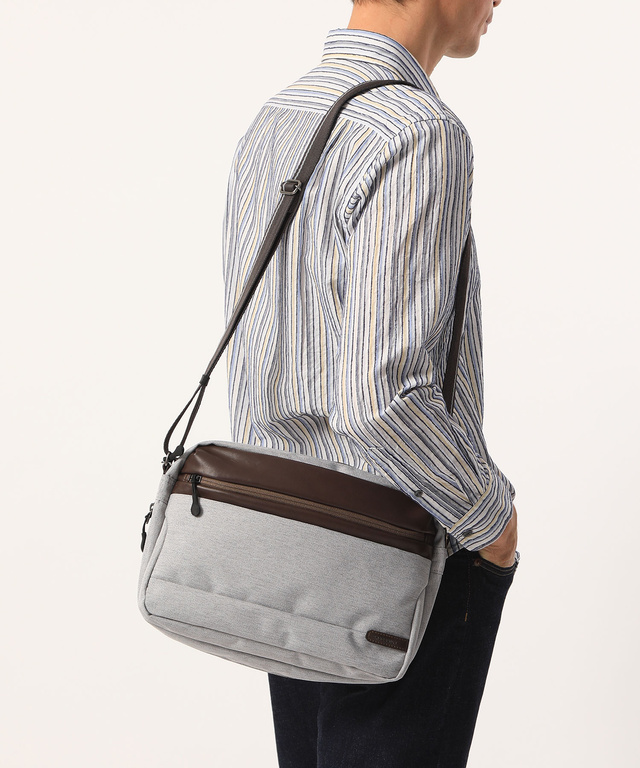 自然な色むらが特徴的なメランジ生地と、しっとりと柔らかく手に馴染むフェイクレザーを使用した、カジュアルな雰囲気のショルダーバッグです。 荷物に合わせて、マチの調節が可能です。 ポケットが充実していて、小ぶりサイズでも機能性抜群。