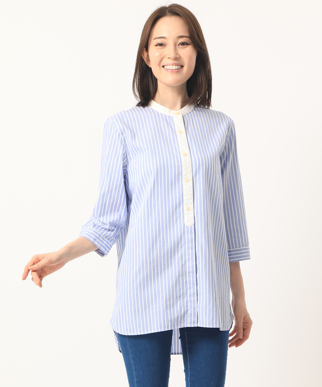 ストライプ切り替え バンドカラー チュニック【オンラ…