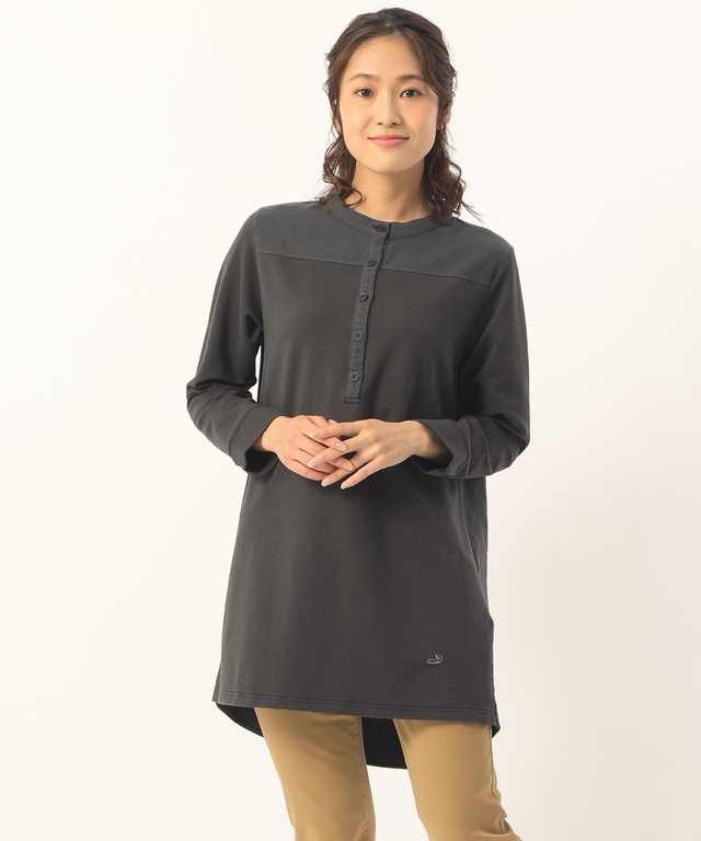 無地見えするカルゼ柄の地柄カットソー素材を使用したチュニック。 肩と後身頃を布帛のビエラ(起毛素材)に切り替えたシャツチュニックの様なトップスです。 バンドカラーのため、1枚着でもタートルネックを合わせても様になるアイテムです。
