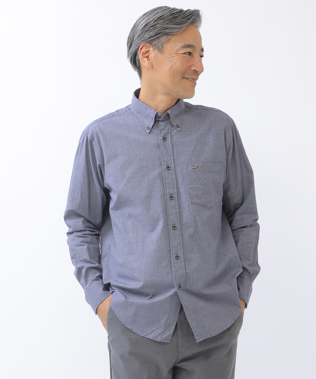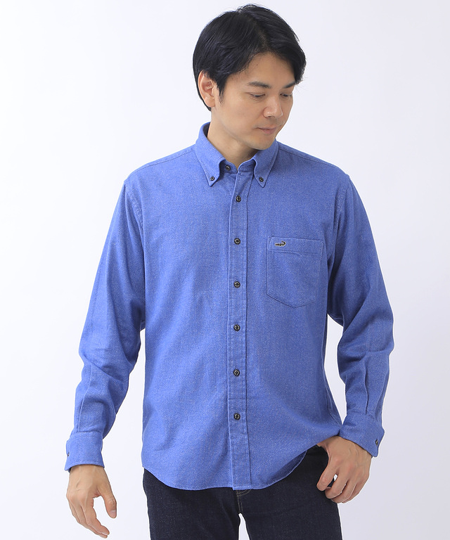秋冬らしいぬくもり感のあるドビービエラ素材のボタンダウンシャツ。 シャンブレーのような表面感のある生地になっています。 濃色のボタンがポイントになっています。 無地調なのでコーディネートしやすく汎用性の高いアイテムです。 ニットやトレーナーの重ね着もおすすめです。