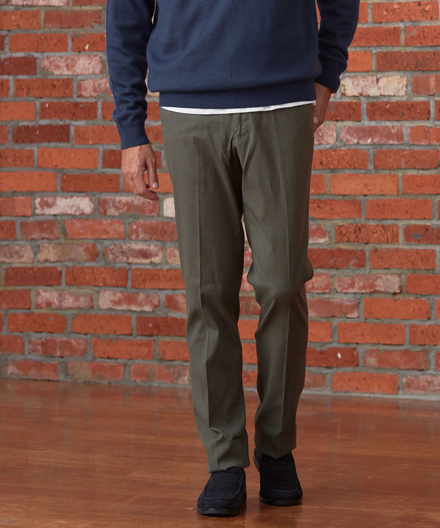 ■デザイン 微起毛のツイル生地を使用した滑らかな風合いのチノパンツです。ベルト脇はアジャスター仕様にしており圧迫感を和らげます。 ※こちらの商品はサンプルで撮影しております。 実際の商品と仕様・加工が若干異なる場合がございます。