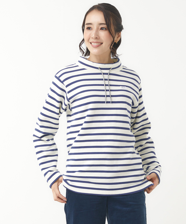 ■デザイン 暖かな裏起毛が嬉しい、ボーダーカットソー。スタンドネックにスピンドルデザインがポイントです。スピンドルはオリジナルのロゴ入りになっています。後ろ着丈が前後差がありやや長めになっているので、体型カバーも暖かさも◎